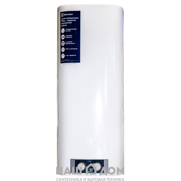 Накопительный водонагреватель объемом 50 л. Максимальная температура воды 75 °С достигается в течение 40 минут. Прибор имеет 3 режима нагрева. Система управления механическая. Индикатор нагрева и включения. Гарантией безопасности является наличие обратного клапана, магниевого анода, систем защиты от перегрева и автоотключения.